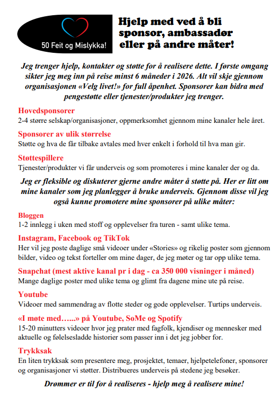 Har du kanskje kontakter eller tips er jeg veldig glad for det! I første omgang tar jeg gjerne imot tips om aktuelle sponsorer og kontaktpersoner. Kanskje har du også forslag til kjente personer med et engasjement innen mental helse? Send meg en e-post så skal jeg love å følge det opp. Send gjerne tips om steder jeg bør besøke og gi meg gjerne noen utfordringer underveis. Dette skal bli både engasjerende, artig og inspirerende - både for meg og dere!